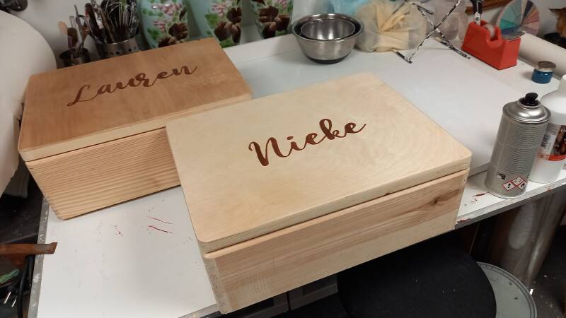 De kist kan met elementen van geboortekaartje beschilderd worden of ander mooi plaatje. Deze krijg ik graag aangeleverd bij de aanvraag.